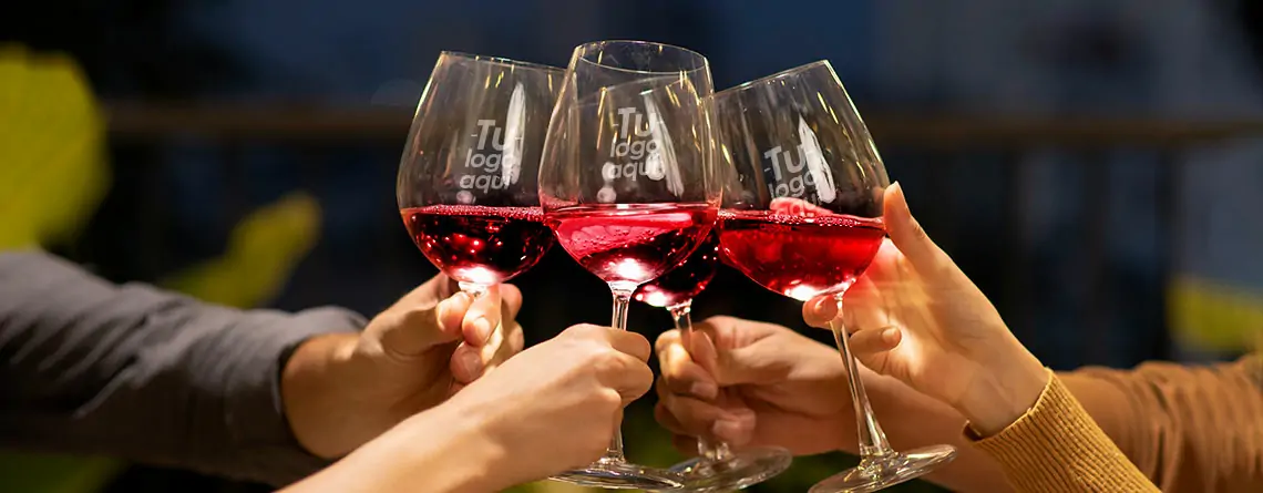 Las copas de vino son elementos clásicos en cualquier evento corporativo, especialmente en cenas y reuniones formales. Personalizar estas copas con el nombre de tu empresa, el logotipo de un evento o incluso el nombre de un invitado especial agrega un toque personal y sofisticado. Esto no solo crea una atmósfera elegante, sino que también refuerza la marca y la asociación.