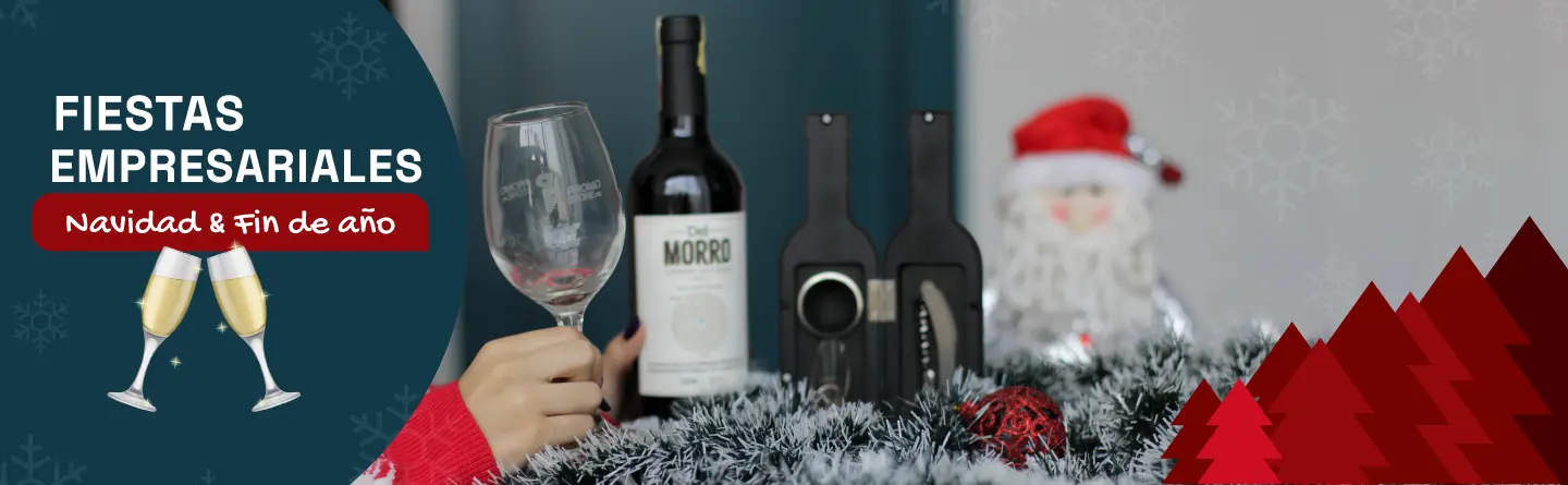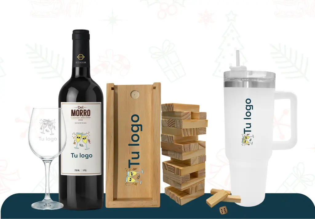 Copas de Vino Personalizadas: Complementa la botella de vino con copas de vino grabadas con el logo de la empresa. Esto agrega un toque de elegancia a las celebraciones navideñas.