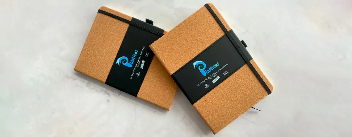 - Libreta Mix: Una combinación perfecta entre estilo y sostenibilidad. La portada de esta libreta está hecha de corcho y acabado cuero, las hojas interiores están hechas de papel ecológico. Es una opción versátil y atractiva para promocionar tu marca.