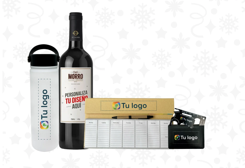 - Combinar el logo de la empresa con elementos festivos en el diseño del artículo. ¿Deseas una plantilla con diseños para productos navideños? Escríbenos.